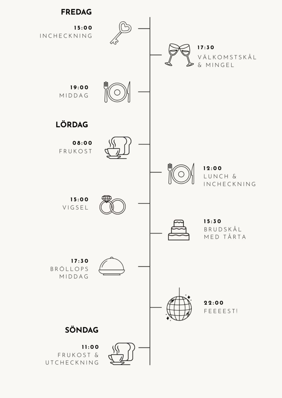 När vi började planera vårt bröllop visste vi att vi ville fira på en plats där alla har möjlighet att bo kvar, så att festen kan fortsätta hela kvällen utan att någon behöver tänka på hemresan. Vi vill ta vara på all tid ihop och vill därför umgås tillsammans en hel helg. Det viktigaste för oss är att få tid att prata och träffa er alla.